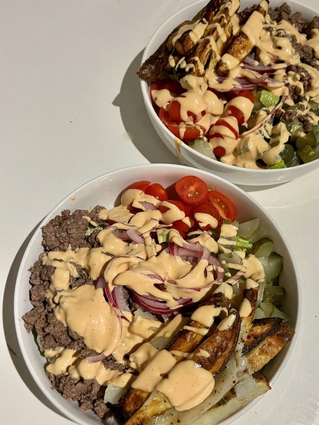 Peel and slice potato into fry-shaped pieces, coat with avocado oil, salt, and pepper. Air fry at 400°F for 15-20 minutes. Chop romaine and add to a bowl with halved cherry tomatoes, sliced red onion, and chopped pickles. In a separate bowl, mix ketchup, mustard, relish, and pickle juice for a homemade burger sauce. Cook lean ground beef in a pan, seasoning with salt and pepper, add the cooked beef on top of the salad, add crispy fries on the side or on top of the bowl, drizzle with the burger sauce.
